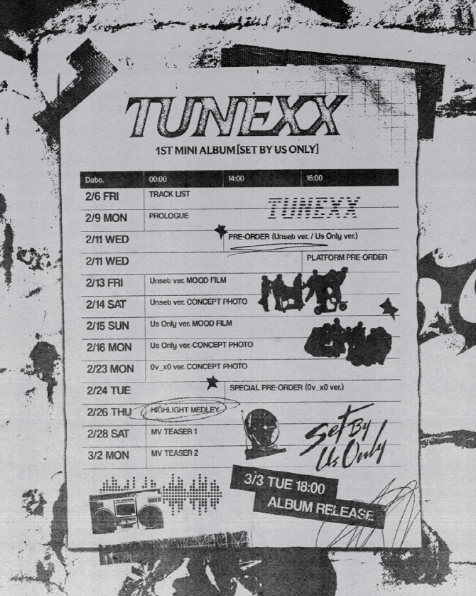 4일 튜넥스는 공식 사회관계망서비스(SNS)를 통해 프로모션 타임테이블 이미지를 공개하며 데뷔 날짜를 공식화했다. 이에 따르면 튜넥스는 내달 3일 정식 데뷔 전까지 프롤로그, 무드 필름과 3종 콘셉트 포토를 포함한 다채로운 티징 콘텐츠를 순차적으로 오픈할 예정이다.