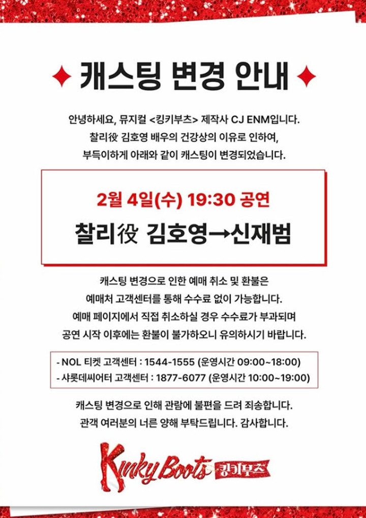 관객들에게 사과의 뜻을 전한 그는 "'킹키부츠' 배우 스태프들께고 너무 죄송한 마음이다. 걱정해 주셔서 감사하고 스케줄 변경을 해준 신재범 배우에게도 미안하고 고맙다. 빠르게 회복해서 건강하게 복귀하겠다"고 밝혔다.
