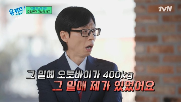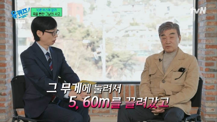 이덕화는 "버스가 만원이 되면 10톤 된다고 하더라, 그 밑에 오토바이가 400kg가 깔렸고, 그 밑에 내가 있었다. 그 상태로 상당한 거리를 끌려갔다"며 "거의 죽었었다"고 말했다.