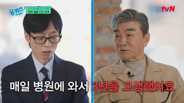3년여간 이어진 투병 생활에서 힘이 되어준 것은 지금의 아내였다. 당시 여자친구였던 아내는 병원에서 숙식을 해가며 병간호를 했다. 이덕화는 "생사도 불확실한 사람을 믿고 3년을 고생했다"고 했고, 유재석은 "사랑의 힘"이라며 감탄했다.