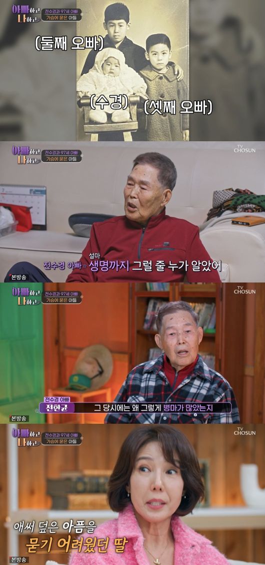 그러자 전수경은 “집에서 아픈 걸 발견하고 병원에 갔냐”라고 되물었다. 아버지는 “엄마가 업고 나한테 오고 왔다갔다 했다. 병원에 갔지만 소용이 없었다. 통곡할 노릇이지”라고 답했다.