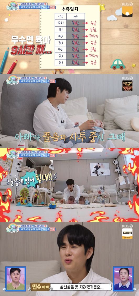 이날 번갈아 잠에서 깬 쌍둥이 때문에 밤을 새운 손민수는 졸음과 사투를 벌이며 육아에 나섰다.