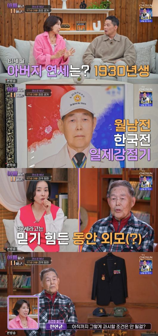 1930년대 태어나 올해 연세 97세가 된 전수경의 아버지는 일제강점기, 광복을 거쳐 한국전쟁에 참전을 했으며, 참전 당시 포로로 잡혀서 북한에 있다가 다시 남한으로 돌아왔고 월남전 파병까지 겪은 한국 산증인이었다. 그리고 현재 스마트폰 시대까지 겪으면서 아버지는 유튜브도 볼 정도로 정정하시다고.