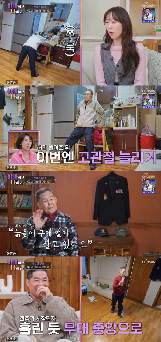 전수경 아버지는 모닝 스트레칭으로 가볍게 허리를 풀어준 뒤, 고관절 늘리기 운동까지 했다. 이에 대해 아버지는 “기지개 한 번 펴는 거죠. 아령도 지금은 할 수가 없다. 나이가 있으니까 빈손으로 아령 시늉 몇 번 한다. 그렇게만 해도 몸이 풀린다. 기가 솟으니까 그렇게 늙음에 구애 없이 살고 있다”라며 건강 비결을 밝혔다.