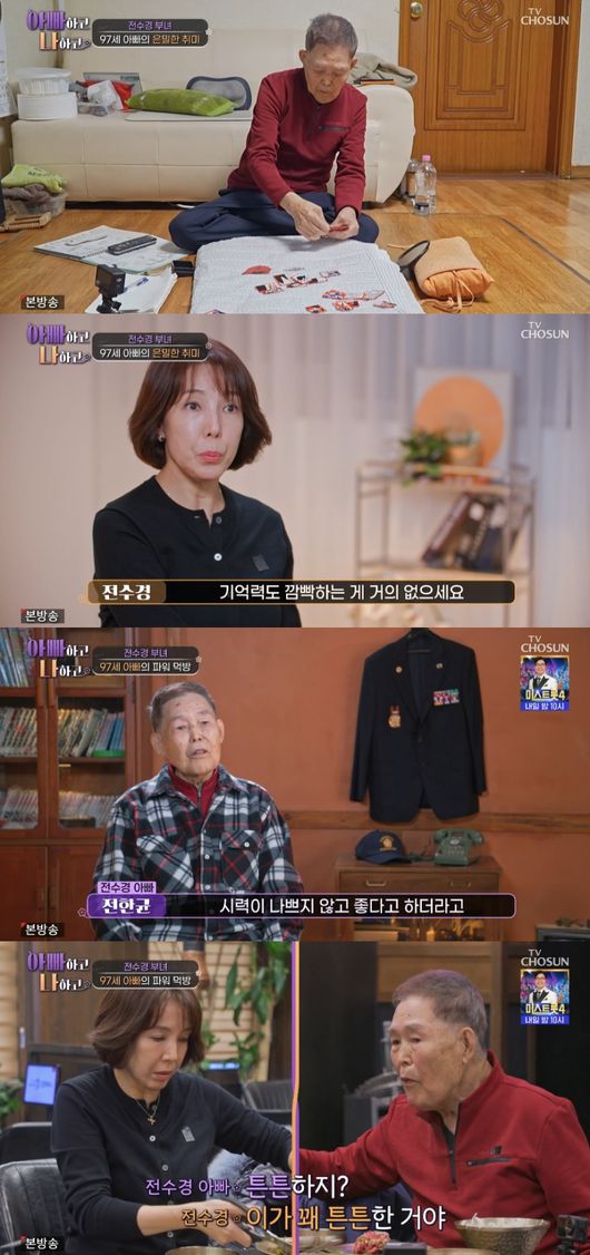 4일 방송된 TV CHOSUN 예능 ‘아빠하고 나하고’에서는 전수경 부녀가 투닥대는 일상을 최초로 공개한 가운데 아버지가 건강 비결을 밝혔다.