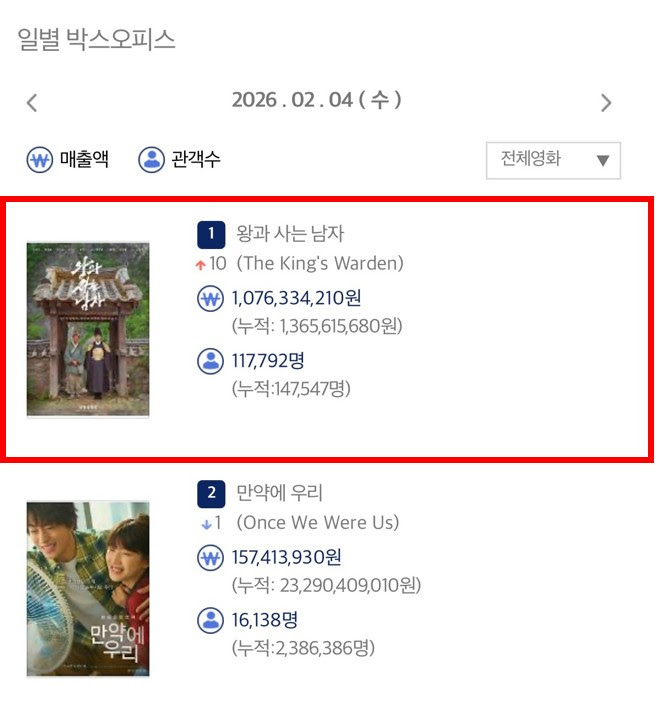 5일 목요일 영화진흥위원회 통합전산망에 따르면 영화 '왕사남'은 개봉 첫날 117,792명 관객을 동원, 누적 관객수 147,547명을 기록해 전체 박스오피스 1위에 올랐다. 개봉 전부터 예매율 1위 자리를 굳건히 지킨 것에 이어 개봉과 동시에 박스오피스 정상에 등극하며 흥행 신호탄을 쏘아 올린 '왕사남'은 역사 속에 숨겨진 단종과 엄흥도의 가슴 뜨거운 이야기를 담아내, 개봉 직후 에그지수 99%를 기록하는 등 관객들의 원픽 사극 영화로 꼽히며 호평 릴레이를 이어가고 있다.
