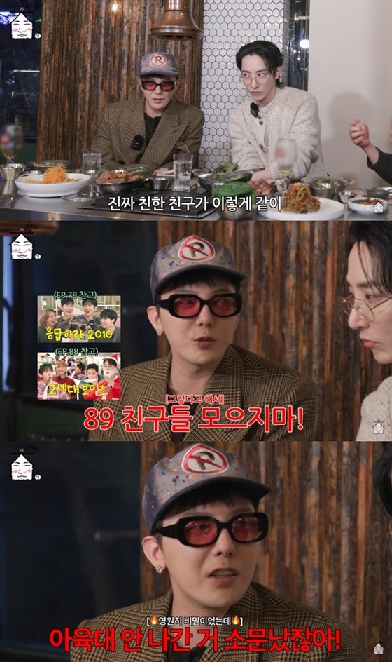 이에 지드래곤이 대성을 향해 "억지로 89 친구들 모으지 마!"라고 경고하며 "너 때문에 괜히 우리 '아육대'(아이돌 육상 대회) 안 나간 거 알잖아"라고 해 시선을 모았다.