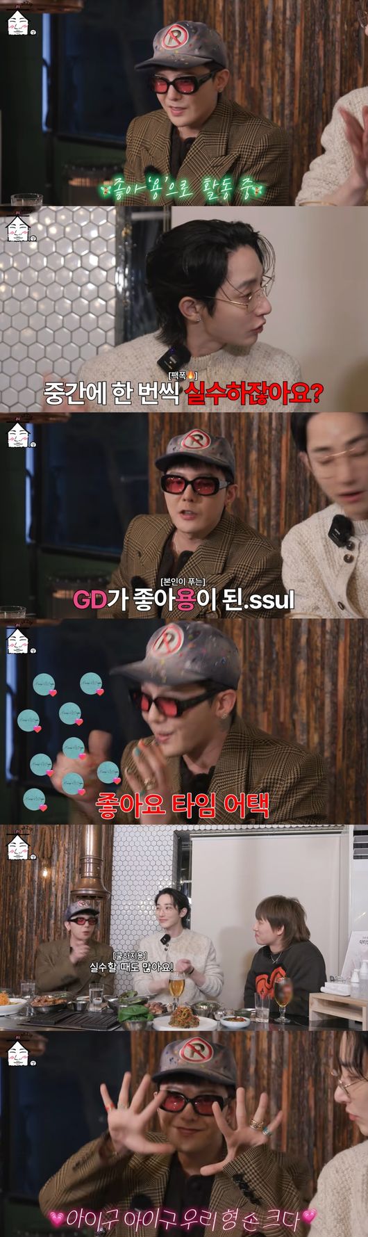 대성은 지드래곤에게 "형이 권지용으로도 활동하지만 인스타에서 좋아요 요정으로도 활동 중이다. 기준이 어떻게 되냐"고 물었고, 이에 이수혁은 "제가 추측하건대 중간에 한 번씩 실수를 하지 않냐. 그래서 개수로 가는 것이 아닐까. 그냥 다 누르는 거다"라며 찐친 면모를 보였다.