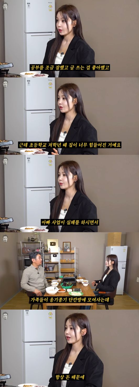 남규리는 "근데 초등학교 저학년 때 이제 집이 너무 힘들어진 거다. 아빠 사업이 실패를 하시면서. 저희가 여섯 식구였다. 딸 세 명에 아들 하나. 가족들이 이렇게 온기종기 단칸방에 사는데 항상 싸우는 이유가 딱 한 가지였던 거다, 항상 돈 때문에. 그거 외적으로는 다 행복한데"라고 털어놨다.