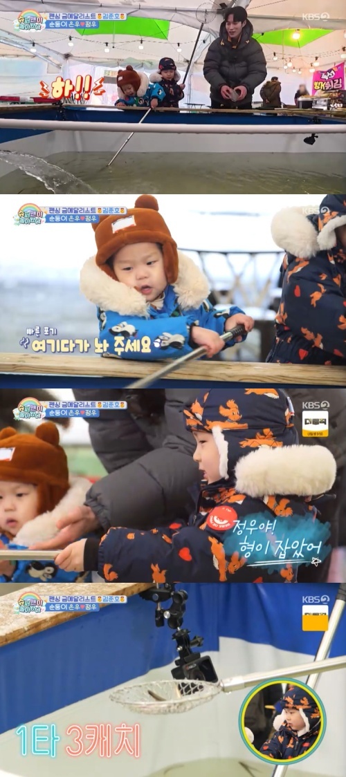 이때 은우가 동생을 위해 직접 잡은 빙어를 양보했다. 정우는 형이 건넨 소중한 빙어를 손에 들고는 "하하하"라며 호탕하게 웃었다. 그러면서 "형 세 마리만 더 잡아줘"라고 부탁했다. 결국 은우가 세 마리를 한 번에 잡아 놀라움을 줬고, 정우가 기뻐하는 모습이 훈훈함을 선사했다.