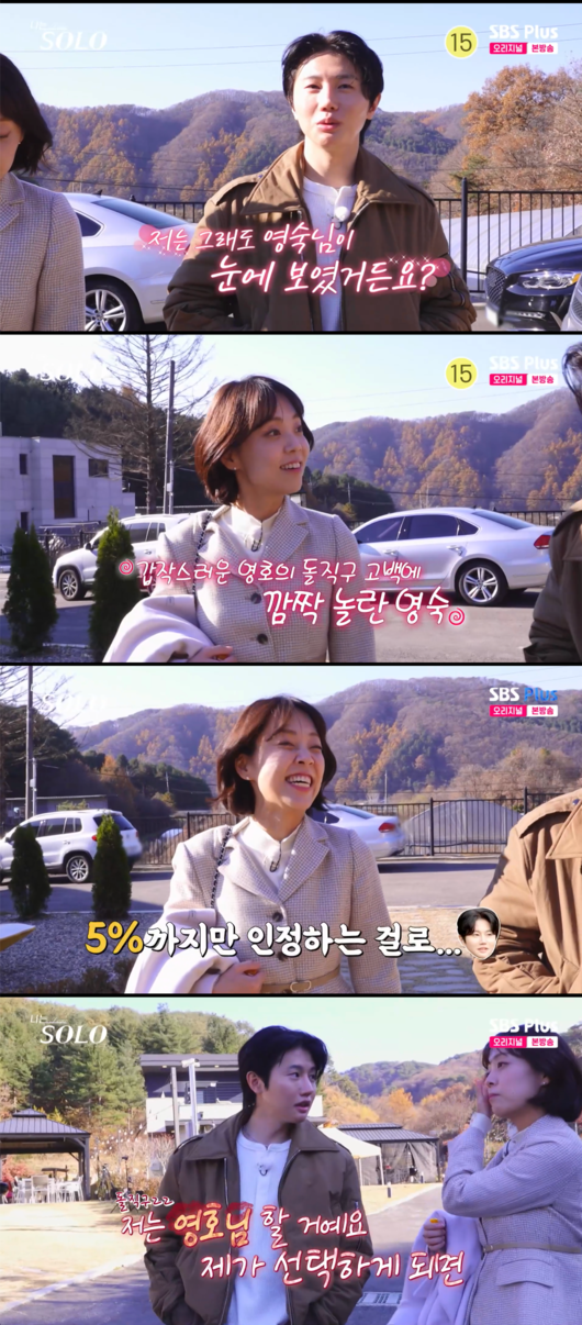 영호는 영숙을 불러 이야기를 나눴다. 첫 투표에서 본인을 선택하지 않은 영숙에게 영호는 “저는 그래도 영숙님이 눈에 보였거든요? 분위기도 제가 추구하는 분위기랑 비슷하시고”라며 진심 어린 마음을 표현했다.