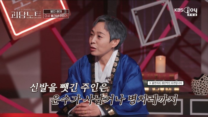 대비궁은 신발 배치와 관련한 풍습도 언급했다. 그는 "보통 신발 앞코를 현관 쪽으로 두는데, 그렇게 두면 귀신이 신고 나간다고 여겼다"면서 "그래서 앞코를 집안을 바라보게 가지런히 돌려놔야 한다"고 조언했다.