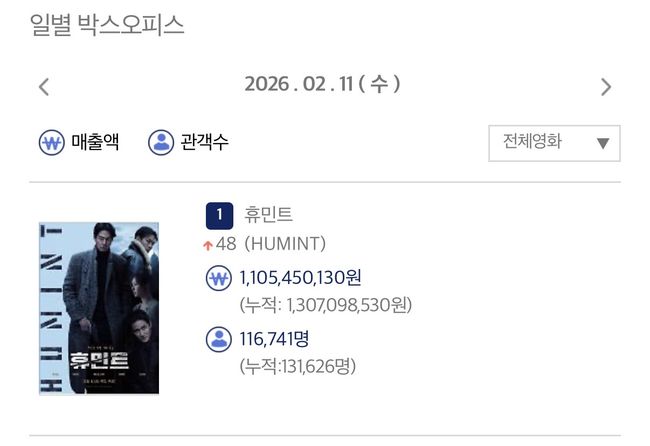 ‘휴민트’가 개봉 첫날 관객수 116,741명, 누적 관객수 131,626명을 기록하며 전체 영화 박스오피스 1위에 등극했다. 개봉 전 약 20만 장에 육박하는 사전 예매량을 기록하며 폭발적인 관심을 받은 ‘휴민트’는 현재 전체 영화 예매율 1위를 유지하며 확실한 대세 영화로 관객들의 선택을 받고 있다.