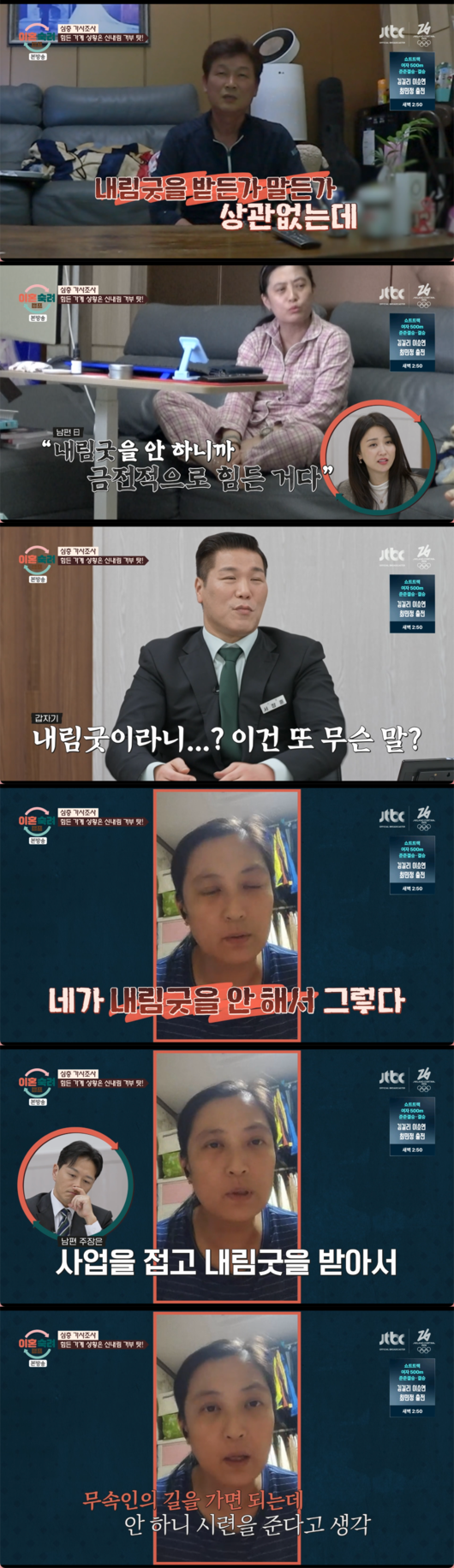 남편은 아내와 대화하던 중 “내림굿을 받든가 말든가 상관없는데”라며 운을 뗐지만, 정작 아내는 남편이 ‘내림굿을 안 해서 금전적으로 힘든 거다’라는 말을 서슴지 않는다며 팽팽하게 맞섰다.