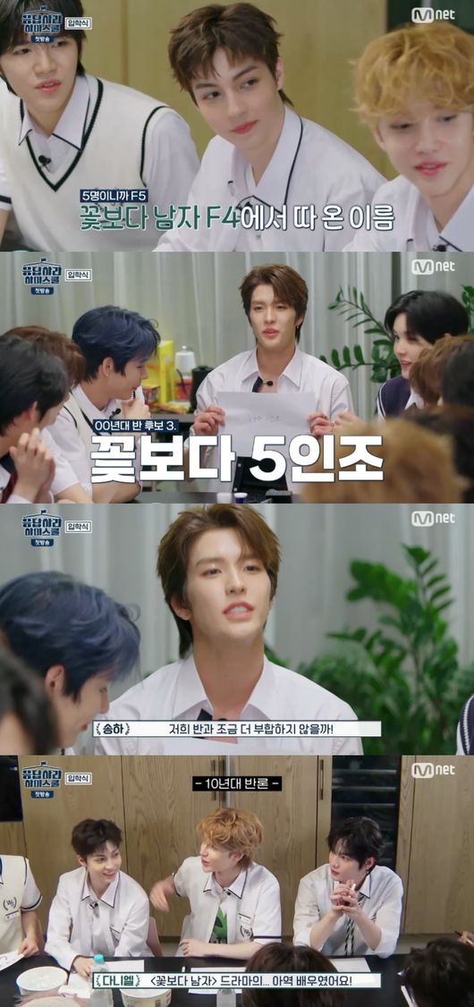 하나둘씩 반 이름을 적은 가운데 10년대 반 찰리는 “F5”라며 “드라마 ‘꽃보다 남자’에서 따왔다”라고 했다. 다음 00년대 반에서 송하가 “하이재킹 한 걸 수도 있는데 ‘꽃보다 5인조’”라고 밝혀 논란(?)을 자아냈다.