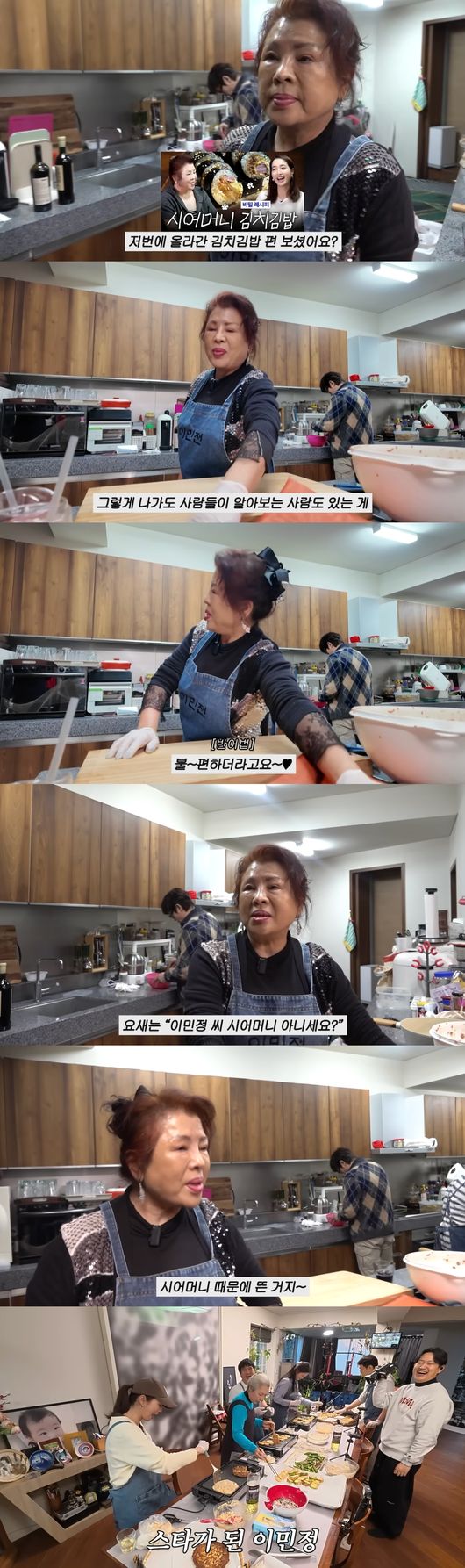 앞서 이민정은 시댁에서 시어머니와 함께 김치김밥을 만들어 화제를 모은 바. 해당 콘텐츠를 봤다는 시어머니는 소감을 묻자 "그냥 부끄러웠다"고 밝혔다.