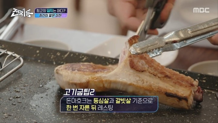 이원일은 가장 먼저 돈마호크와 등심덧살을 불판에 올렸다. 이원일은 "얇은 돼지고기를 구울 때는 육즙이 올라오면 바로 뒤집으면 된다"고 굽기 팁을 전했다. 이때 고기 표면에 맺히는 육즙이 화면을 통해 전달돼 감탄을 자아냈다.