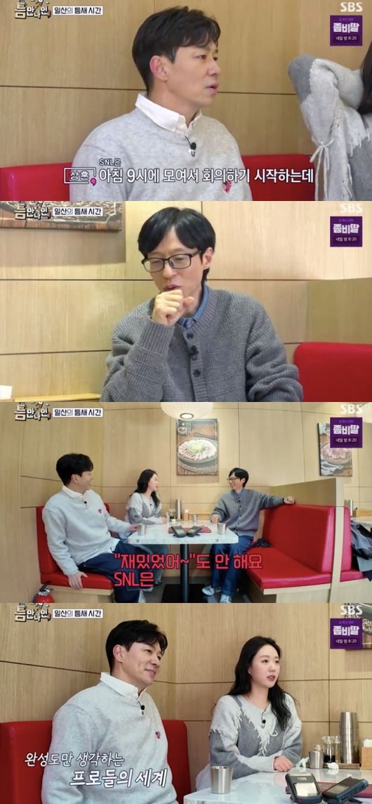 지예은과 정상훈의 대화를 지켜보던 유재석은 “너희 ‘SNL’ 하면서 대화 안 하지?”라고 물었고 정상훈은 “대화할 시간이 없다. 9시에 모여서 회의하기 시작한다. 머리 굴리느라 힘들다. 사담을 못 한다”라고 말했다. 지예은은 “(서로) ‘재밌었어’도 안 한다. 바로 배역이 바뀐다. 살벌하다”라고 말했다.