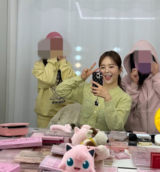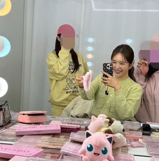 장영란은 연한 초록빛 카디건에 화사한 핑크 블러셔, 섀도우가 가득 깔린 메이크업 제품과 더불어 사진을 찍으면서 특유의 발랄한 느낌을 자아냈다.