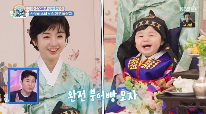 이날 방송에서는 돌잔치를 기념해 한옥을 찾은 심씨 가족의 모습과 함께, 하루 엄마 히라이 사야가 ‘슈돌’에 최초로 등장해 시선을 모았다. MC 김종민과 랄랄은 “진짜 똑같이 생겼다. 웃으면 아빠, 그냥 있으면 엄마를 쏙 닮았다”며 하루의 레전드 비주얼에 감탄을 금치 못했다.