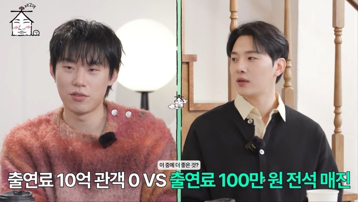 밸런스 게임 질문으로 '출연료 10억 관객 0명 vs 출연료 100만원 전석 매진'이 주어지자 두 사람은 입을 모아 "후자"라고 답했다.