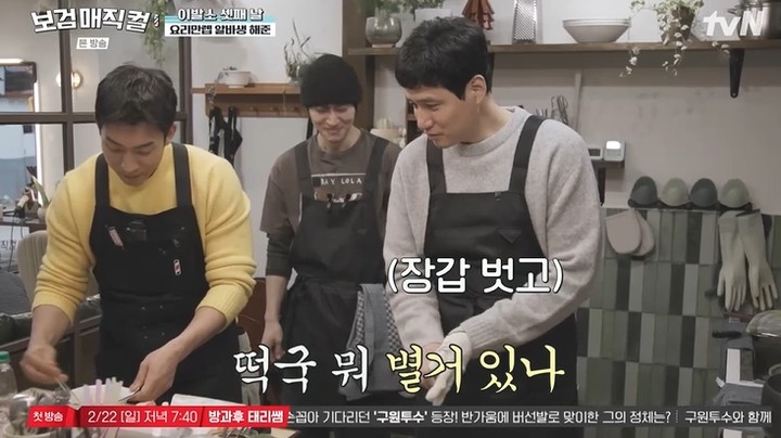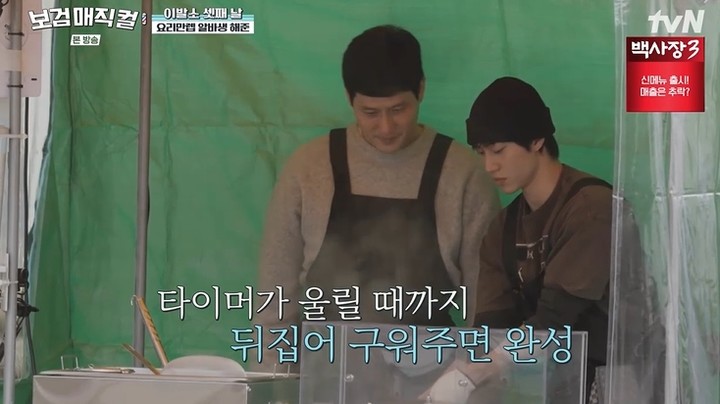 그는 "여기 일이 많네. 놀다 가는 줄 알았는데"라고 투덜대면서도 떡국을 끓이며 지단을 굽는 등 '열일 알바생'으로 분했다.