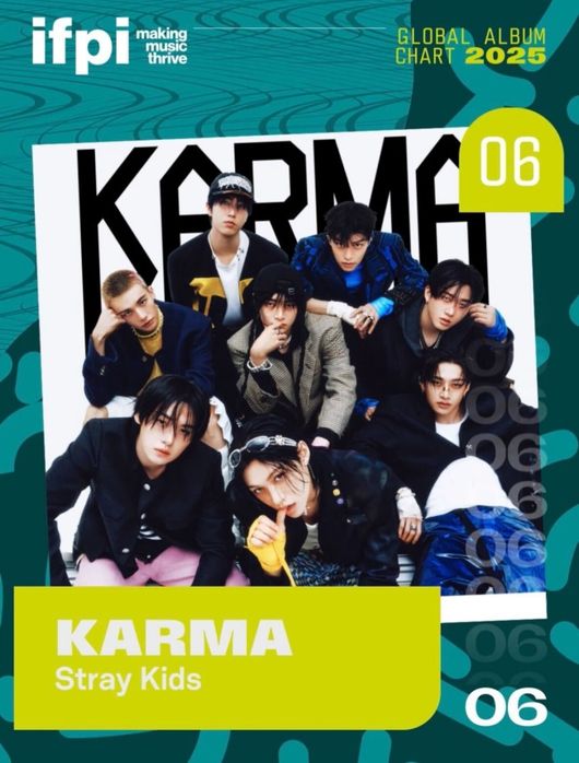 21일 국제음반산업협회가 공식 홈페이지와 SNS 채널을 통해 발표한 바에 따르면, 스트레이 키즈 정규 4집 'KARMA'(카르마)는 2025 '글로벌 앨범 차트'(Global Album Chart) 6위를 차지했다. 스트레이 키즈는 2022년 'MAXIDENT'(맥시던트), 2023년 '★★★★★ (5-STAR)'(파이브스타)와 '樂-STAR'(락스타), 2024년 'ATE'(에이트)에 이어 4년 연속 해당 차트에 이름을 올렸다.