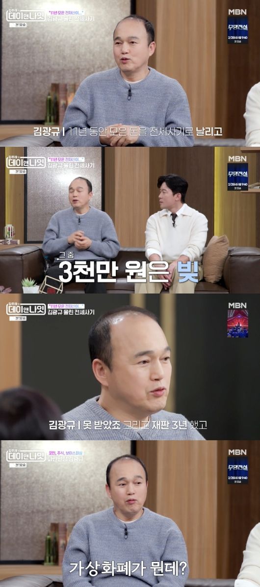김주하는 전세사기에 대해 물었고 김광규는 “밥 먹고 있는데 문을 두드리더니 월세를 내라고 하더라. 나는 전세로 들어왔는데. 미친 듯이 달려서 부동산 사무실에 갔는데 책상이 다 없고 짐이 빠져 있더라. 그다음 사람이 ‘내 돈 내놔’ 하면서 들어오더라”라고 말했다.