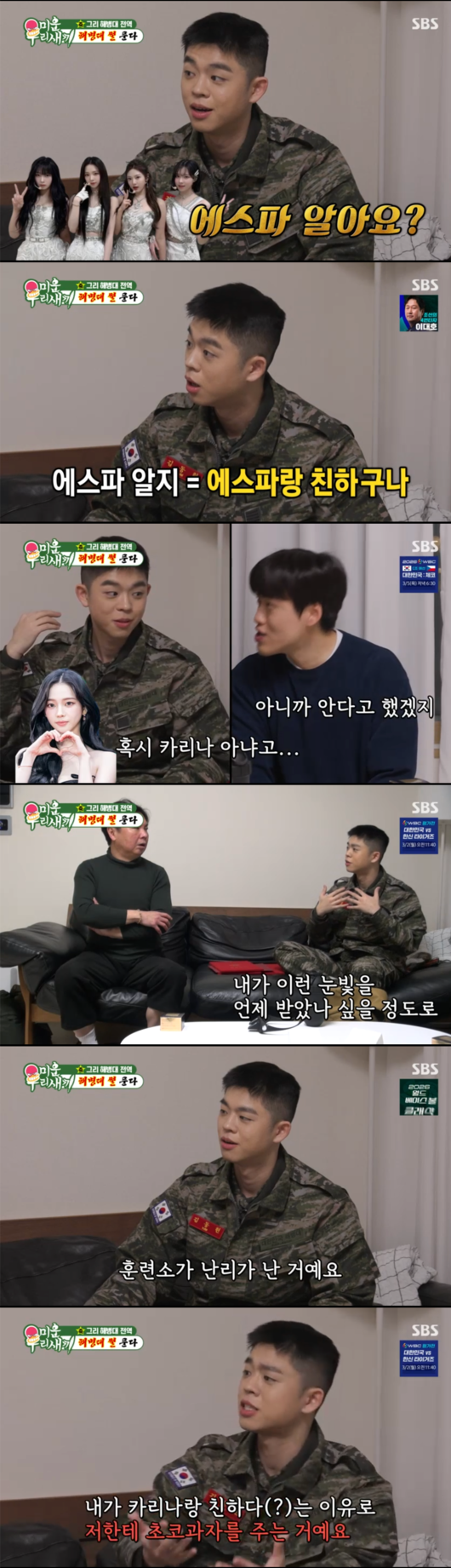 그리는 “그냥 누군지 알아서 안다고 했는데 연예인이면 다 친한 줄 안다. (훈련소 동기들이) 에스파랑 친하다는 소문 들었다고. 카리나 아냐고. 내가 이런 눈빛을 받아본 적 있나 하는 눈빛을 받아본다”며 당시 상황을 설명했다.