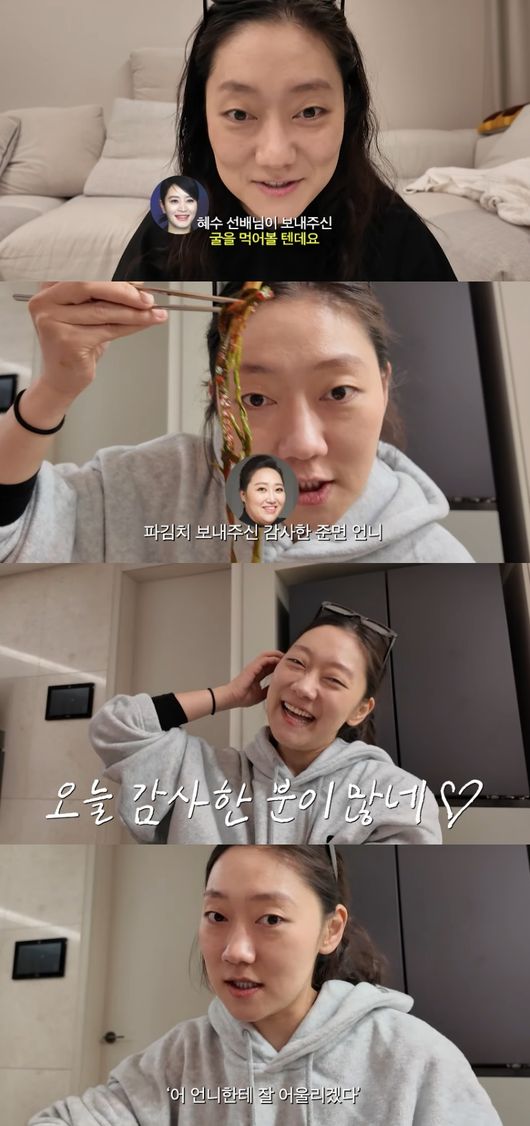 한껏 들뜬 박경혜는 “혜리가 구워준 고기랑 준면 언니가 보내준 파김치. 완전히 오늘 먹는 날이다”라며 “맛있는 굴에 삼겹살, 파김치까지 오늘. 너무 맛있다”라고 고마움을 드러냈다.