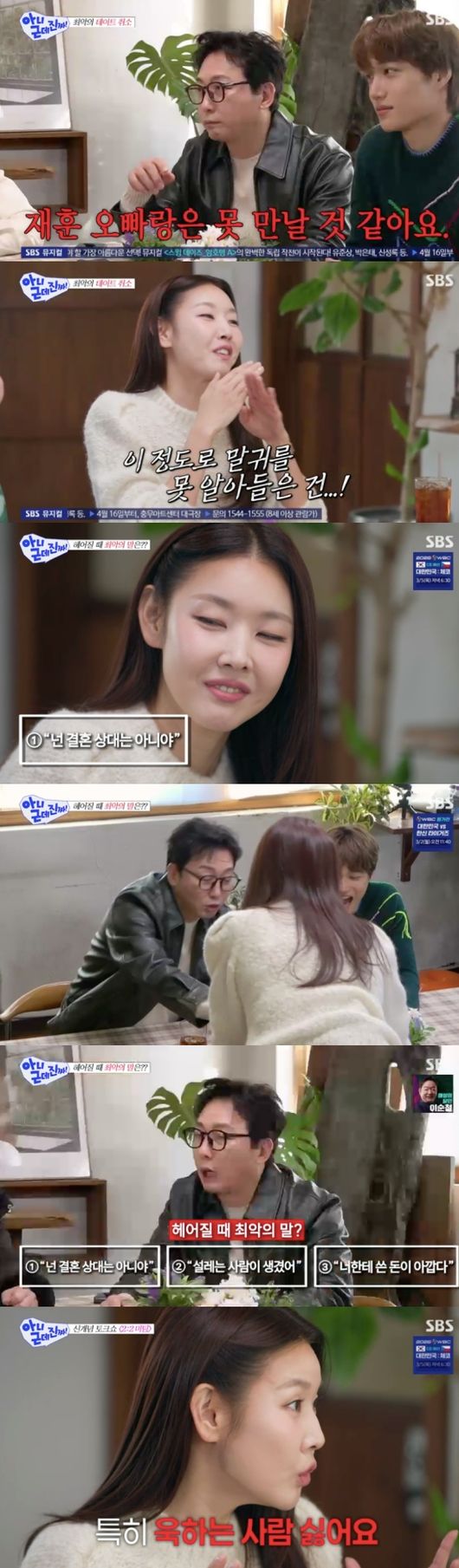 한혜진은 “넌 결혼 상대는 아니야”라는 말이 ‘헤어질 때 최악의 말’이라고 언급했고, 이수지는 “진짜 들은 말이냐. 울먹였다”라고 덧붙였다. 한혜진은 “안 슬프냐. 긁힐 것 같다”라고 솔직하게 말했다.
