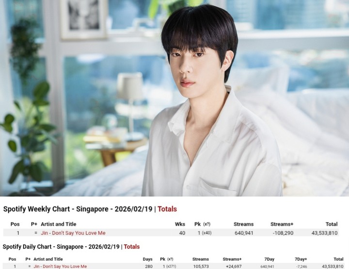 25일 스포티파이에 따르면 진의 미니 2집 ‘에코(Echo)’ 타이틀곡 ‘Don't Say You Love Me(돈 세이 유 러브 미)’는 현지 데일리 차트(Spotify Singapore Daily Chart)에서 단 한 번도 1위를 내주지 않은 채 280일 연속 정상을 달리고 있다. 위클리 차트(Spotify Singapore Weekly Chart)에서도 40주 연속 1위를 지키며 장기 흥행 흐름을 굳혔다.