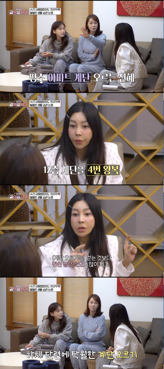 평소 어떤 운동을 하느냐는 질문에 황신혜는 계단 오르기 운동을 언급하며, 12층 계단을 4번이나 왕복한다고 밝혀 놀라움을 자아냈다. 황신혜는 “(계단 오르기는) 걷는 것보다 훨씬 열량 소모도 많이 되고”라며, 특히 하체 단련에 탁월한 효과가 있다고 설명했다.