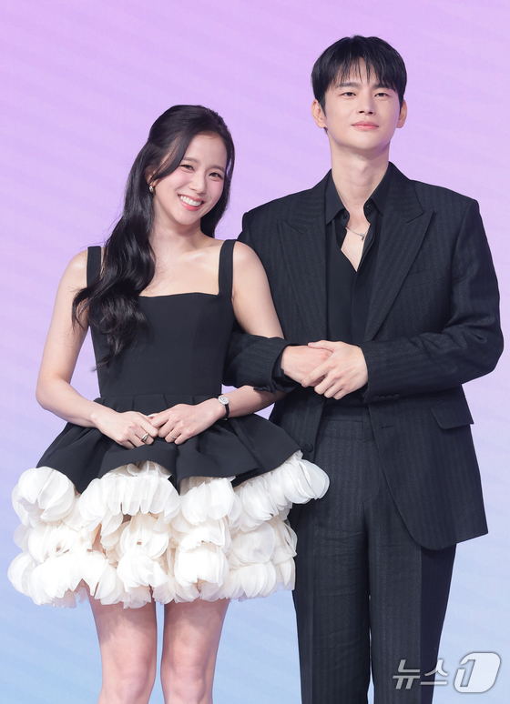 가수 겸 배우 지수와 서인국(오른쪽)이 26일 서울 종로구 JW메리어트 동대문스퀘어서울에서 열린 넷플릭스 새 시리즈 '월간남친' 제작발표회에서 포즈를 취하고 있다. '월간남친'은 현실 생활에 지친 웹툰 PD 미래(지수 분)가 가상 연애 시뮬레이션을 통해 연애를 구독하고 체험해 보는 로망 실현 로맨틱 코미디다. 2026.2.26 © 뉴스1 권현진 기자