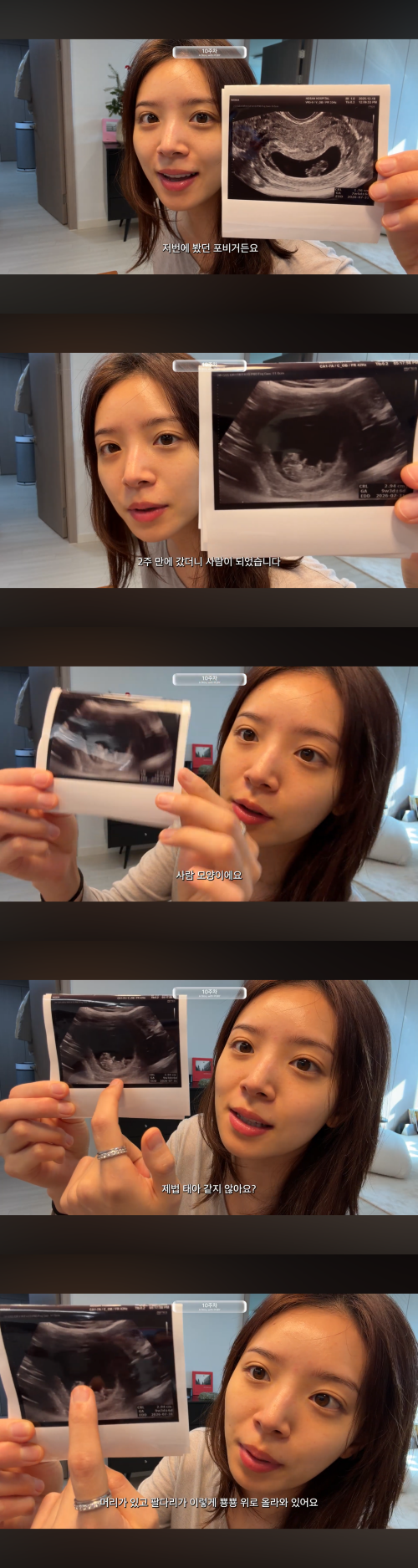 이날 영상에서 김지영은 최근 병원을 다녀왔다며 태아의 초음파 사진을 공개했다. 그는 “어제 병원 다녀왔는데 포비가 또 컸다”며 “저번에 봤던 포비는 젤리곰 모양이었는데 팔다리가 보인다”고 말했다. 이어 “2주 만에 갔더니 사람이 됐다. 제법 태아 같은 모습이다. 머리랑 팔다리가 위로 올라가 있다”고 전했다.