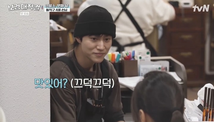 한편에서 '간식 담당' 곽동연은 귀여운 꼬마 도우미 선희와 다인이를 위해 주방에서 직접 말차 티라미수를 만들어 대접했다. 꼬마 손님들은 한입 먹어보더니 "음, 맛있어요. 짭조름하고 딱 고소하다"라고 심사평 같은 후기를 말해 곽동연을 웃게 했다.