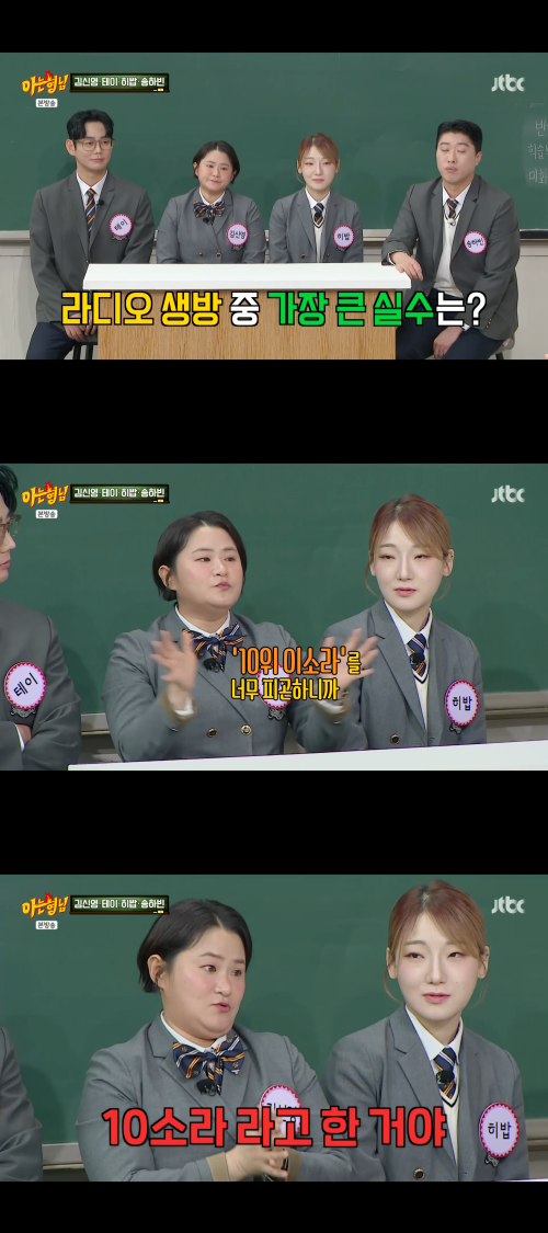이날 김신영은 라디오 생방송 도중 있었던 발음 실수를 떠올렸다. 그는 “10위 이소라의 ‘신청곡’ 듣고 올게요라고 해야 했는데 너무 피곤해서 ‘10소라’라고 말한 적이 있다”고 밝혔다. 예상치 못한 실수담에 출연자들은 웃음을 보였다.