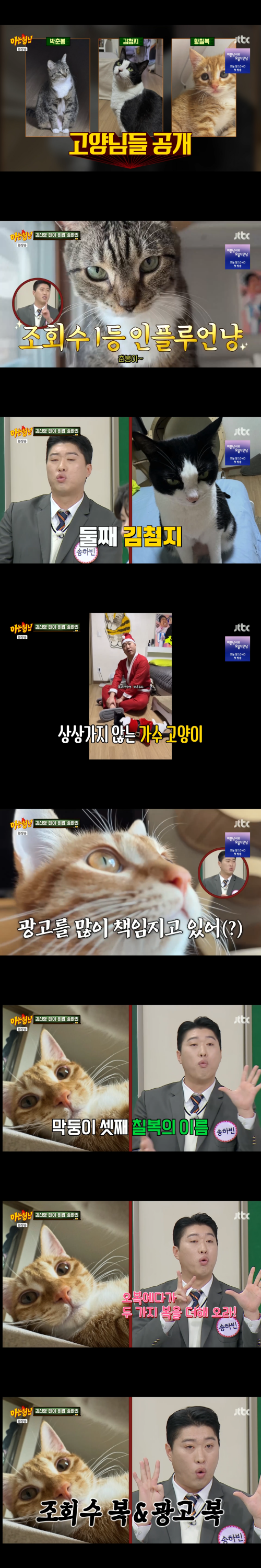 송하빈은 “첫째 박춘봉이라는 애는 조회수 1등이다. 춘봉이 얼굴이 걸리면 조회수 100만은 나온다”며 “둘째 김첨지는 노래를 너무 잘하고 사람이랑 대화가 된다”고 소개했다. 이어 “셋째 칠복이는 최근에 들어왔는데 생후 10개월이고 우리 집 광고를 책임지고 있다”고 말해 웃음을 자아냈다.