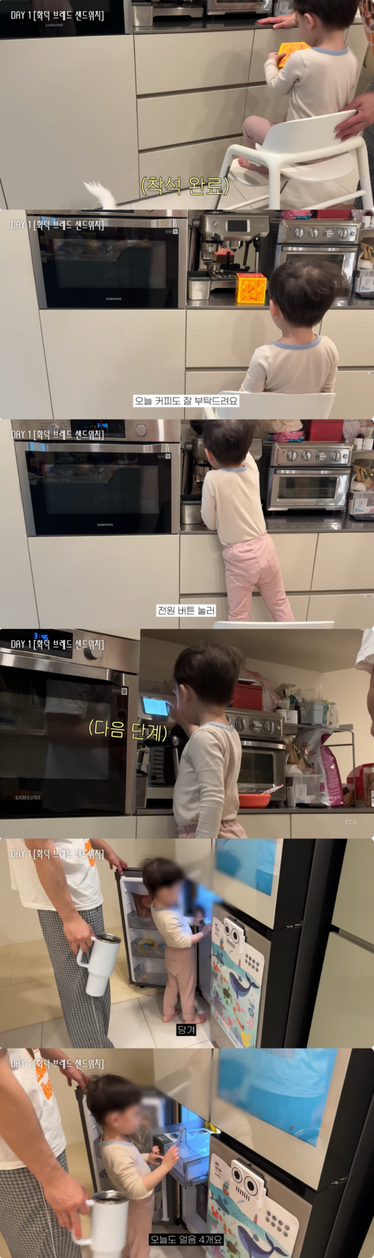 커피가 완성되자 원이는 치명적인 뒤태를 뽐내며 아빠를 향해 "다 됐슴니다"라고 야무지게 외치기도. 이어 원이는 능숙한 솜씨로 얼음 트레이에서 얼음을 꺼내 텀블러에 담은 뒤, 사용한 트레이를 다시 밀어 넣고 냉동실 문까지 완벽하게 닫는 깔끔한 뒷정리 실력을 선보였다.