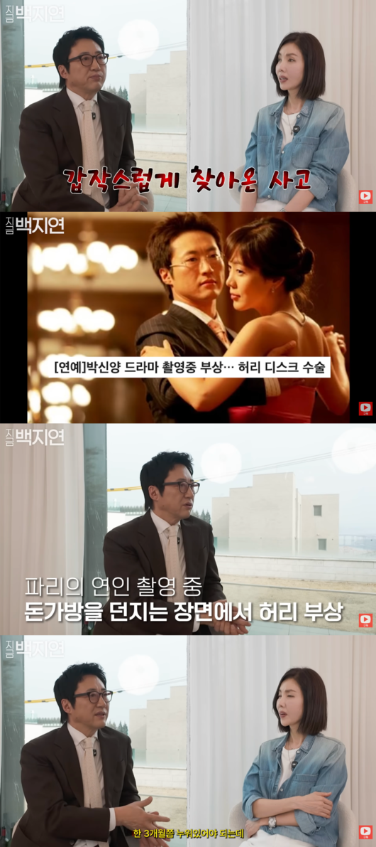 이날 박신양은 ‘파리의 연인’ 촬영 중 부상을 입었다며 “드라마 찍고 영화 찍고 하다가 허리를 4번 정도 부러졌다. 드라마 ‘파리의 연인’ 찍을 때 파리에서 가방을 집어던지는 장면에서 허리를 삐끗했다. 디스크가 파열되고, 한국에서 수술을 받으면 3개월쯤 누워있어야 되는데 그럴 시간이 없었다”고 털어놨다.