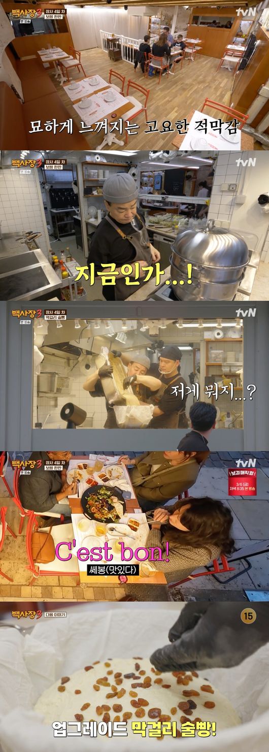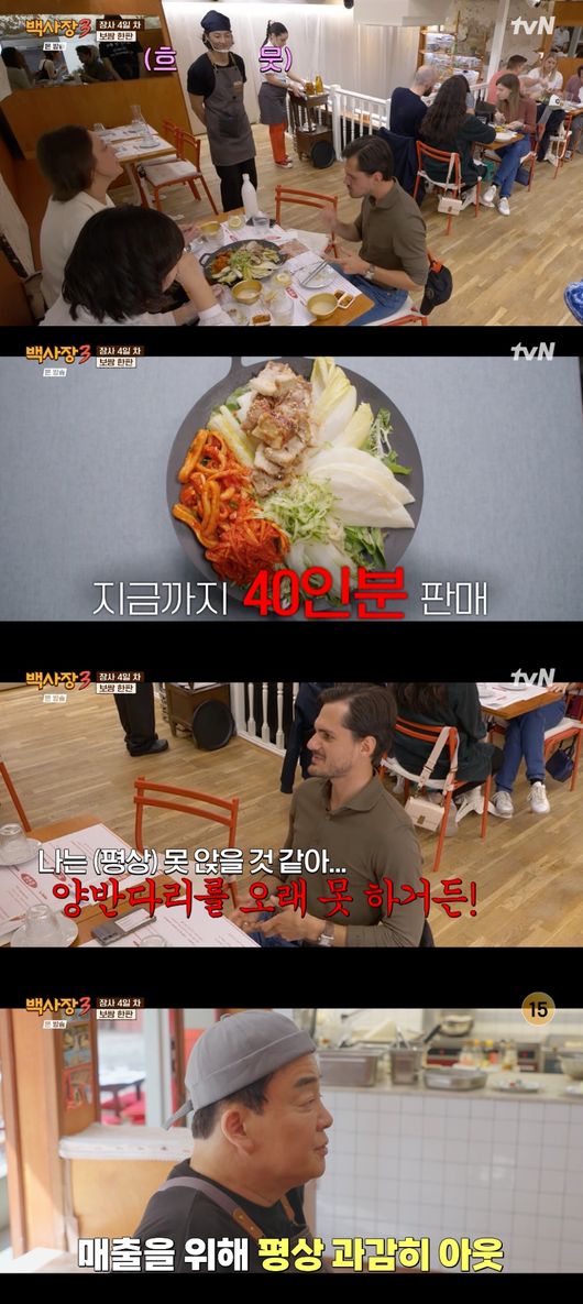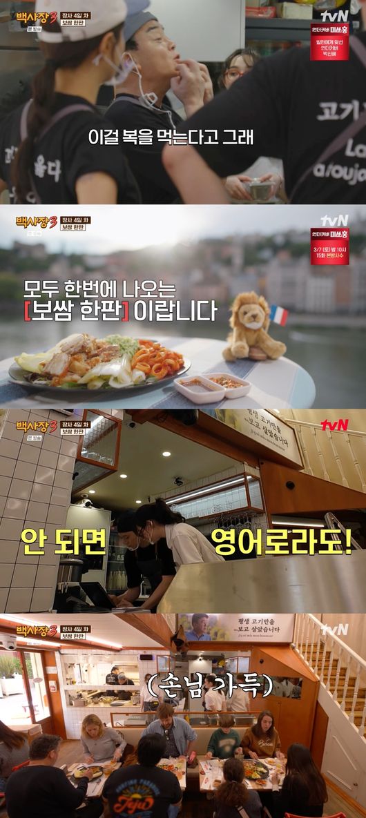 지난 3일 밤 방송된 tvN 예능 프로그램 '백사장3'에서는 '한판집' 백종원, 이장우, 존박, 권유리, 윤시윤이 미식의 나라 프랑스에서 장사 4일 차를 맞았다.