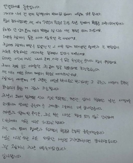 7일 220엔터테인먼트 측은 이동원의 자필 편지를 공개하며 크나큰 탈퇴 소식을 공표했다.