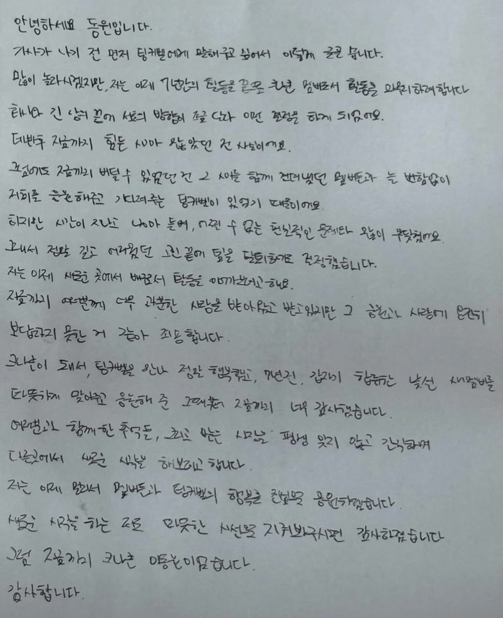 또한 팬들을 향해 “과분한 사랑을 받았음에도 온전히 보답하지 못한 것 같아 죄송하다. 받은 사랑을 평생 잊지 않고 간직하겠다”며 감사의 인사를 전했다.