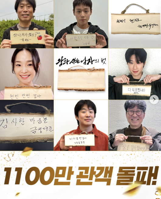 1100만 관객 돌파를 기념해 작품의 주역들이 직접 적은 ‘6글자 흥행 소감’도 공개돼 눈길을 끌었다. 영화 속에서 인물들이 나무 명패에 이름을 적어 걸던 장면을 모티브로 한 것으로, 배우와 제작진이 각자의 메시지를 남겼다.
