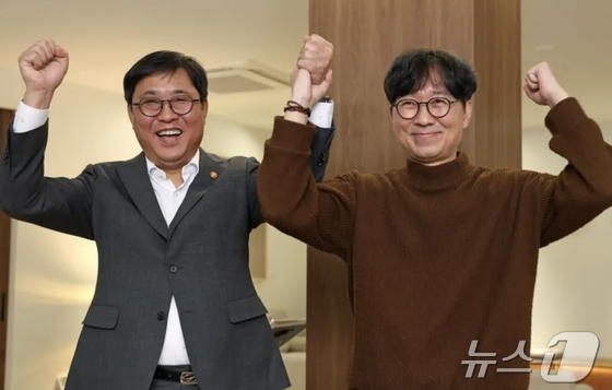 최휘영 문화체육관광부 장관이 지난 7일 자신의 사회관계망서비스(SNS)에 천만 관객을 돌파한 영화 '왕과 사는 남자'의 장항준 감독을 만나 인사를 나누고 케이크와 꽃다발을 건네는 사진을 공개하고, 축하 메시지를 함께 게재했다. (최휘영 장관 인스타그램 캡처, 재판매 및 DB 금지) 2026.3.7 © 뉴스1 김진환 기자