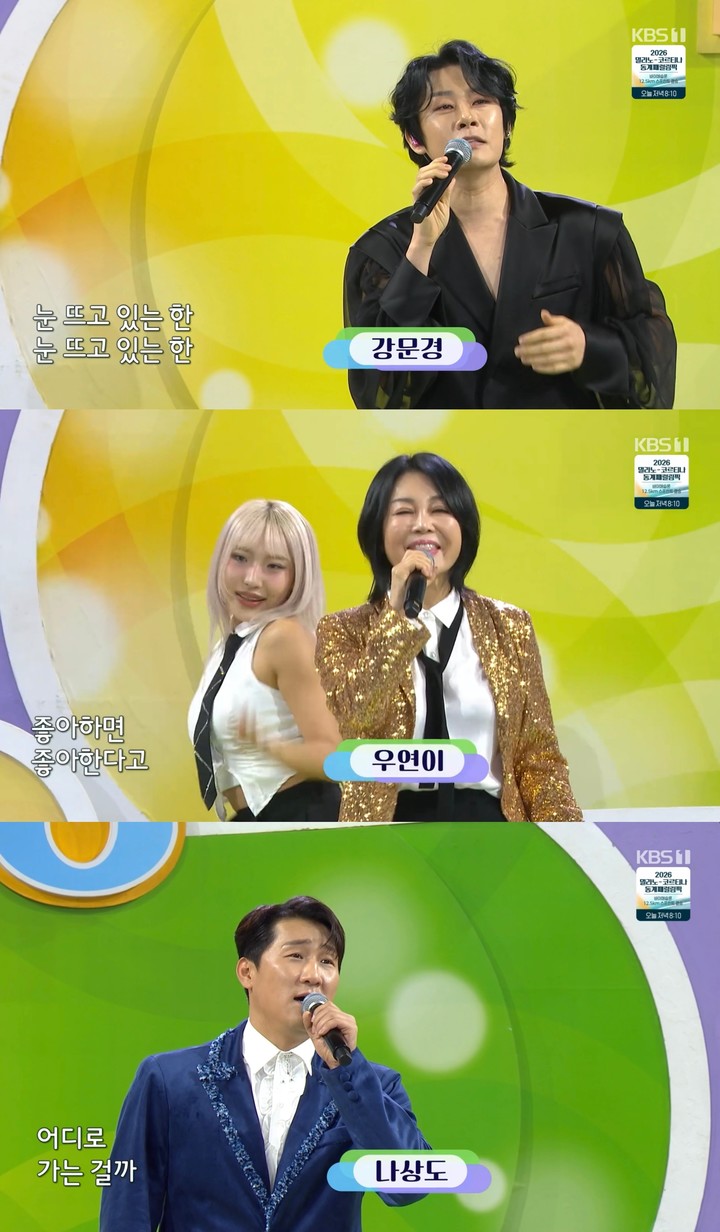 경연의 열기는 축하 무대가 이어받았다. ‘차세대 가왕’ 박서진이 ‘지나야’로 화려한 오프닝을 열었고, 이어 전국노래자랑 출신 ‘미소천사’ 나상도가 ‘어무니’, ‘믿고 보는 가수’ 우연이가 ‘줄게요’를 부르며 명불허전의 무대를 꾸몄다. 또한 유민은 ‘야 좋냐’로 활력을 더했으며, ‘뽕신’ 강문경이 ‘눈 뜨고 있는 한’으로 마지막 무대를 장식하며 피날레를 장식했다.