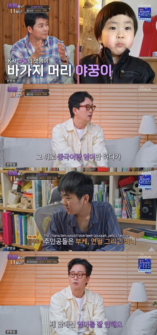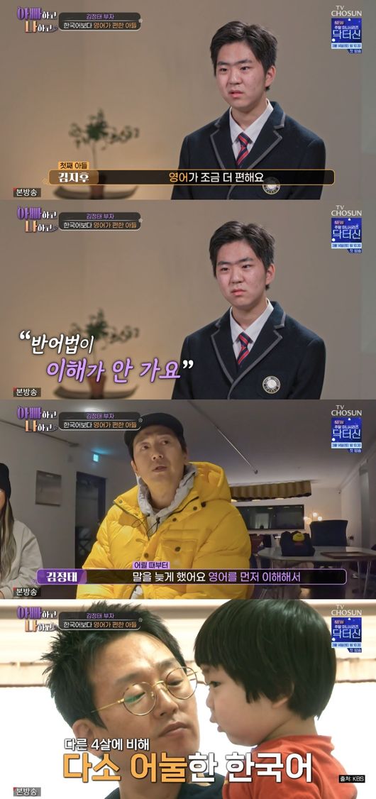 또 첫째 아들은 2~3살 때 우연히 듣게 된 ‘ABC송’을 듣고 꽂히기 시작했다고. 김정태는 “지금은 제가 알아 들을 수 업는 수준이다. 영어식 한국 표현들이 많다. 아들이 ‘본인은 미국 사람으로 태어나야 하는데 왜 한국 사람을 태어나야 하냐’고 하더라”라며 국어 과외까지 받았다고 밝혔다.