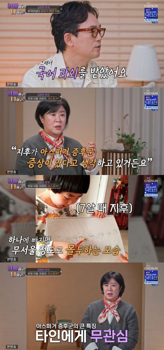 [OSEN=박하영 기자] ‘아빠하고 나하고 시즌3’ 김정태 부부가 첫째 아들이 아스파거 증후군이 의심된다고 고백했다.
