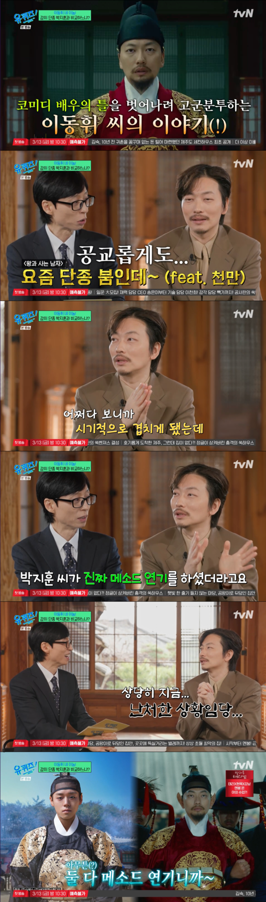 이동휘는 이번 작품에서 ‘왕’ 역할을 맡았음을 밝히며 기대를 모았다. 이에 MC 유재석이 “요즘 박지훈 씨를 비롯해 ‘단종 붐’이 일고 있다”라고 언급하자, 이동휘는 예상치 못한 경쟁 구도에 당혹스러움을 감추지 못했다.