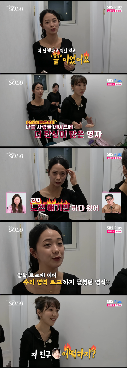 영자는 영식과의 데이트를 언급하며 “저 산책하고 치킨 먹고 끝이었어요”라고 운을 뗐다. 이어 화기애애했던 다른 출연자들의 데이트를 부러워하던 영자는 급기야 데이트 중 나눈 대화 내용을 언급하기도.